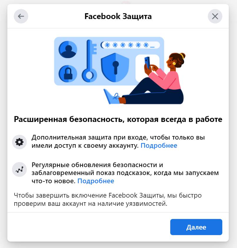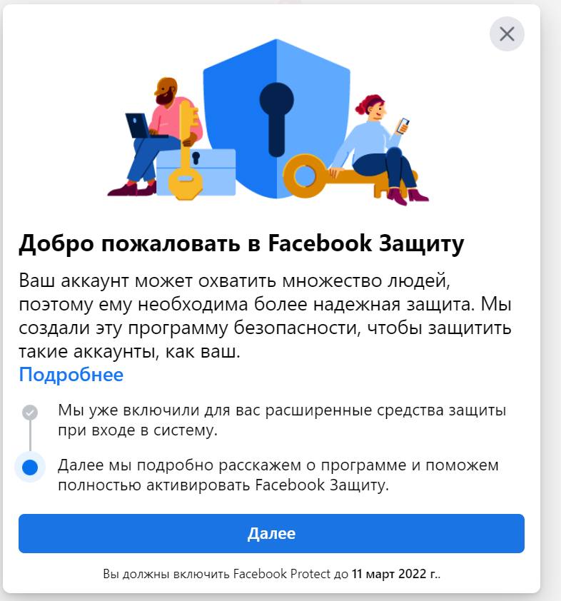Ֆեյսբուքը նոր նախաձեռնություն ունի՝ մեծ թվով ընկերներ, հետևորդներ ունեցող օգտատերերին առաջարկում է միացնել Facebook Protect (Facebook Защита): Եթե ձեզ մոտ նման բան է հայտնվել, անպայման գնացեք համապատասխան քայլերով և ակտիվացրեք ծառայությունը։ Ստորև ներկայացնում ենք ծառայությունը ակտիվացնելու անհրաժեշտ քայլերը, եթե Ձեր օգտահաշվում երկփուլային անվտանգությունն արդեն իսկ ակտիվ է։ Իսկ եթե Ձեր մոտ միացնելու գործընթացում խնդիրներ առաջանան՝ դիմեք CyberHUB-AM-ին, անպայման կօգնենք։